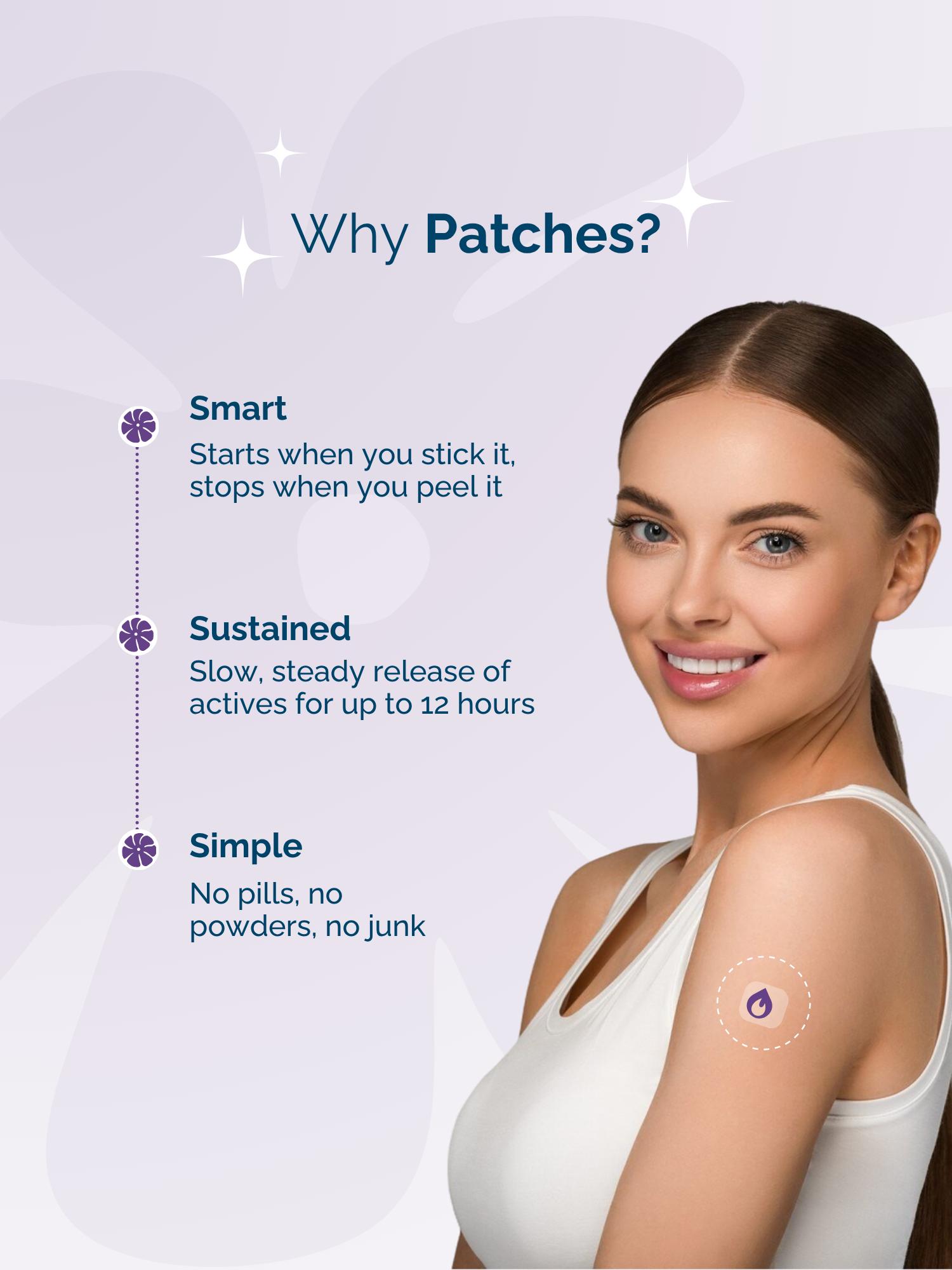 The patch gets to work the moment you apply it, delivering nutrients steadily through your skin for 8-12 hours. The chromogenic ink will gradually fade, giving you a visible signal that your patch is active.