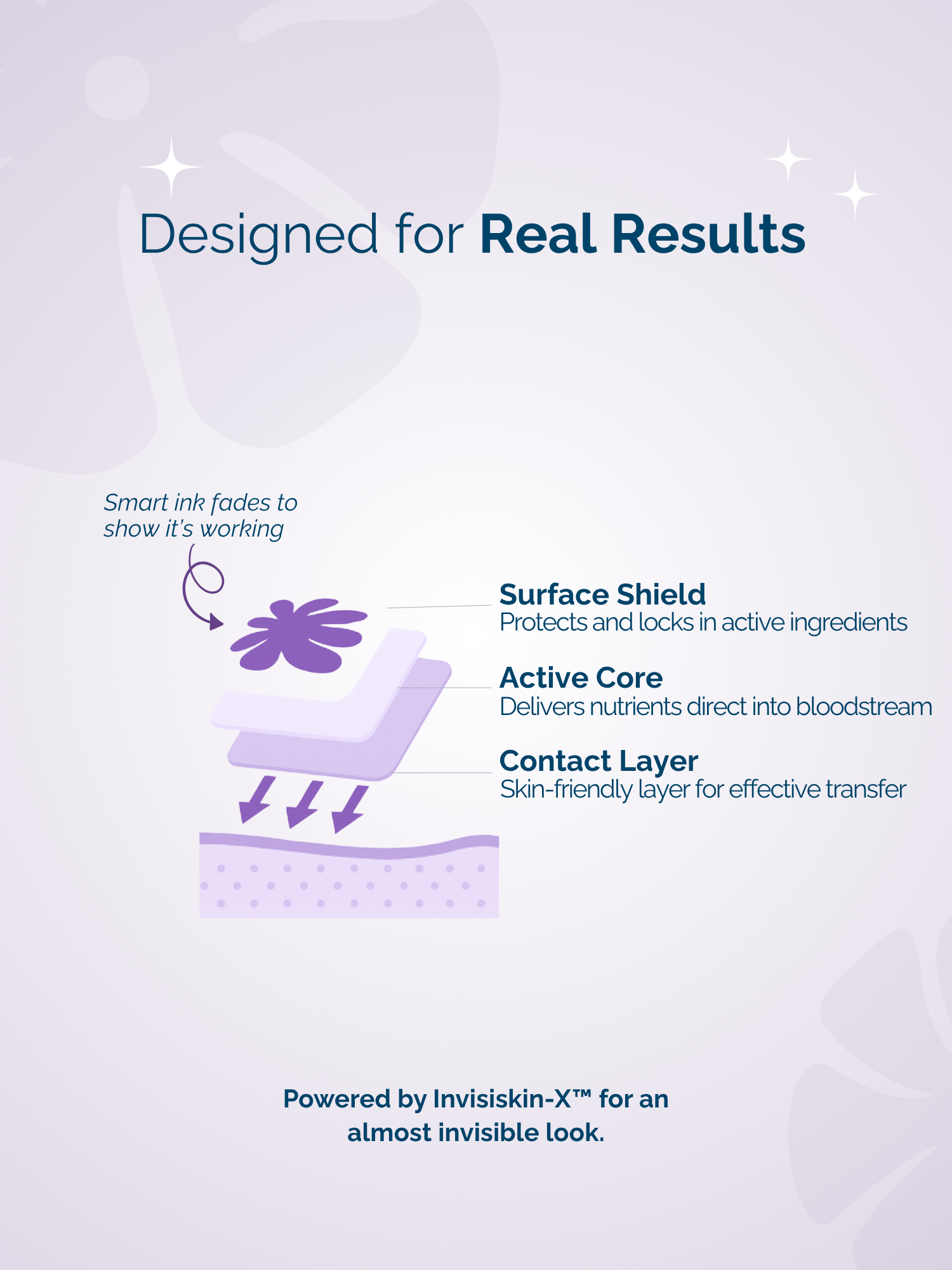 The patch gets to work the moment you apply it, delivering nutrients steadily through your skin for 8-12 hours. The chromogenic ink will gradually fade, giving you a visible signal that your patch is active.
