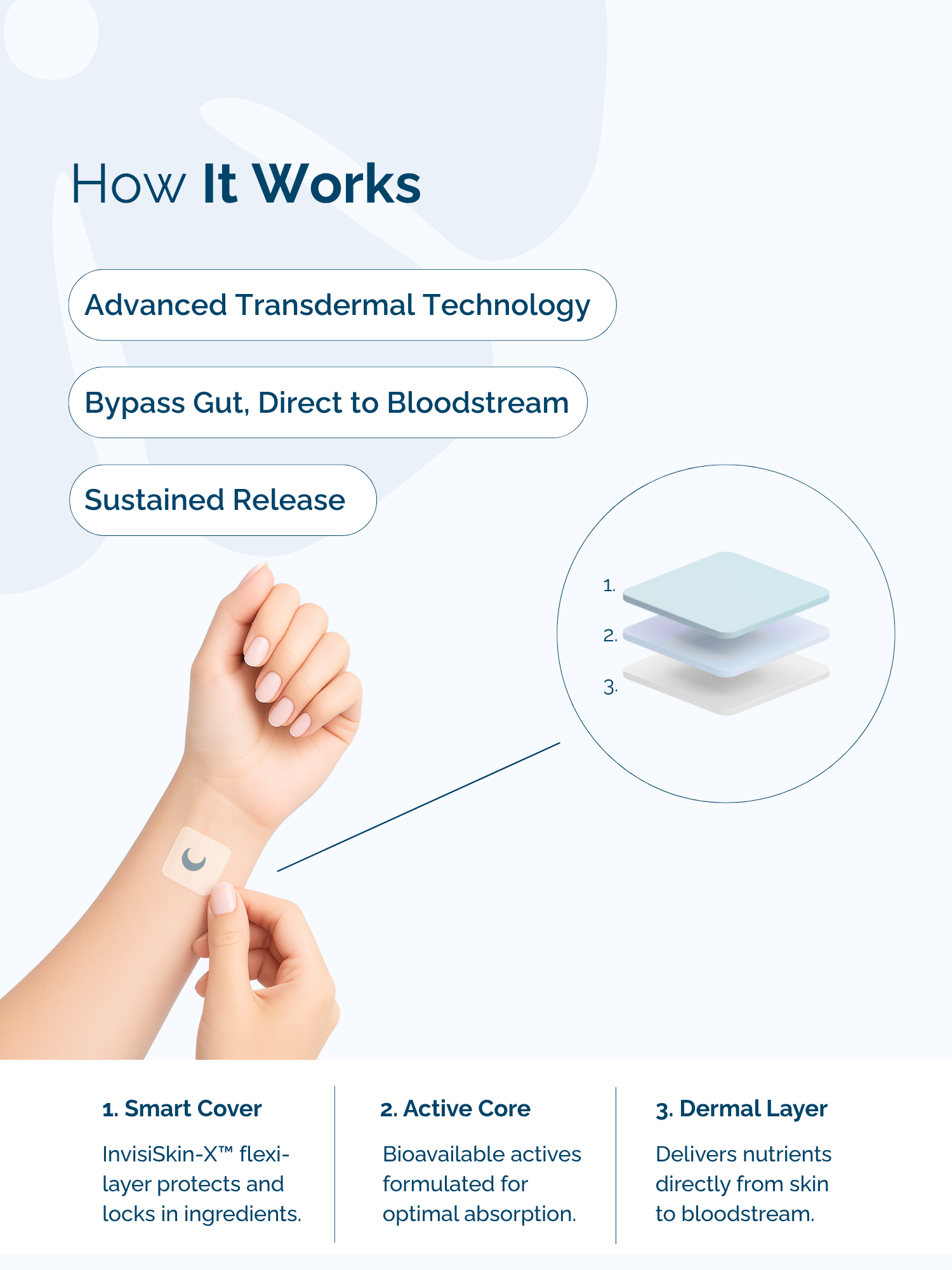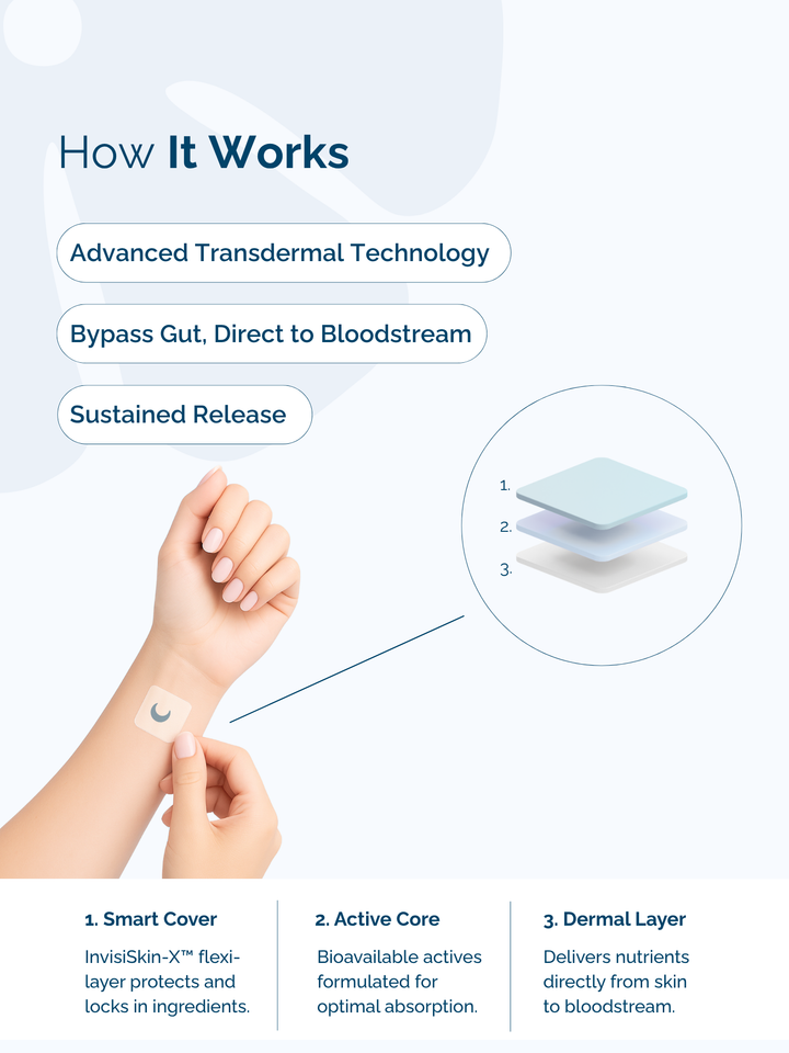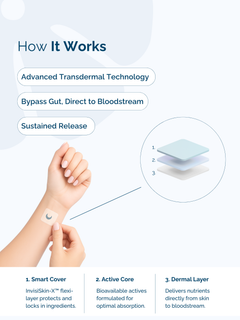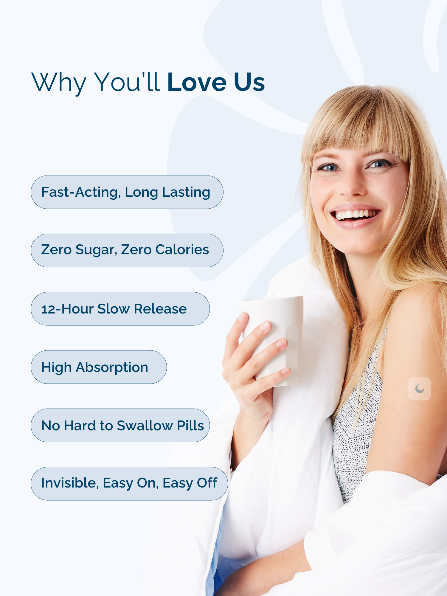 Infused with natural sleep supporters like melatonin, valerian root, and magnesium our sleep patch helps you drift off smoothly and stay snoozing soundly. Just stick it on before bed and let it guide you into deep, restful sleep to wake refreshed and rested.